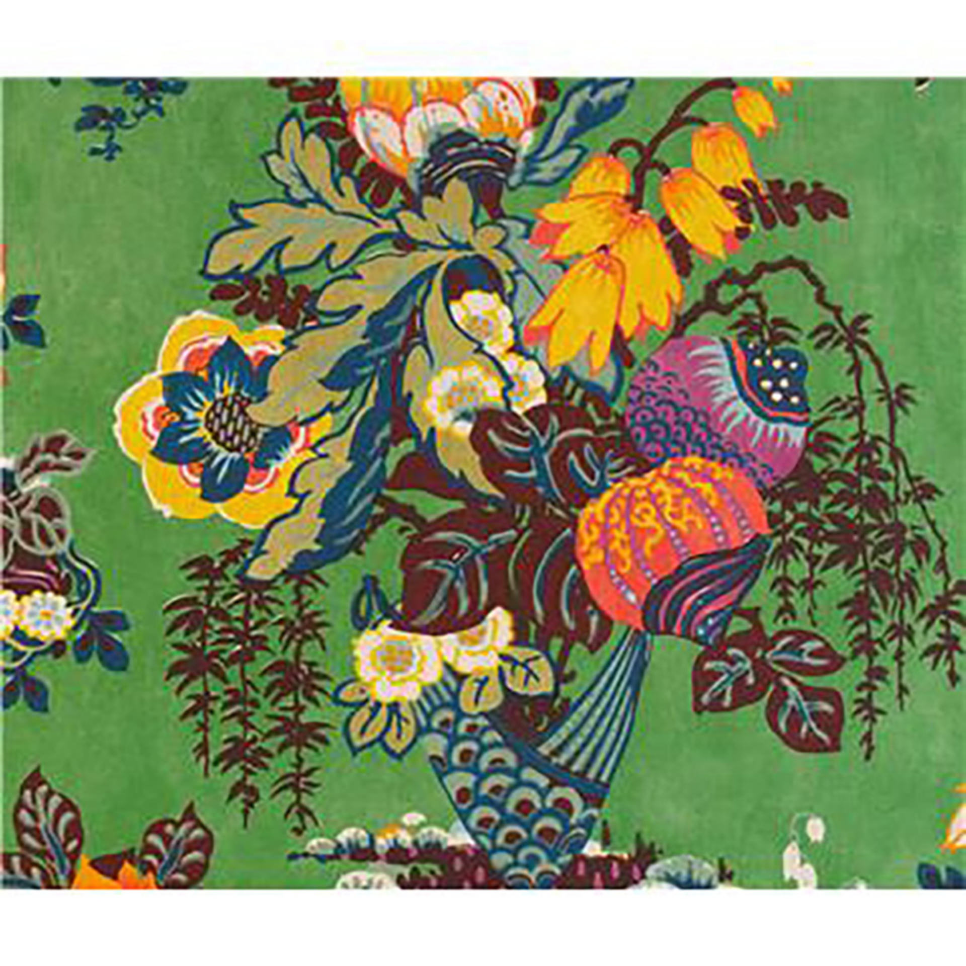This fabric falls in the green/azure color group and features a lively print that could make a bright and fun inspirational piece for a living room. With an accent chair or ottoman in this bold fabric, you’ll have plenty of colors to pull from to create a vibrant living space. Consider cream colored walls and sofa. Yellow, orange, pink and blue can be incorporated through an area rug, artwork and accessories such as a lamp.