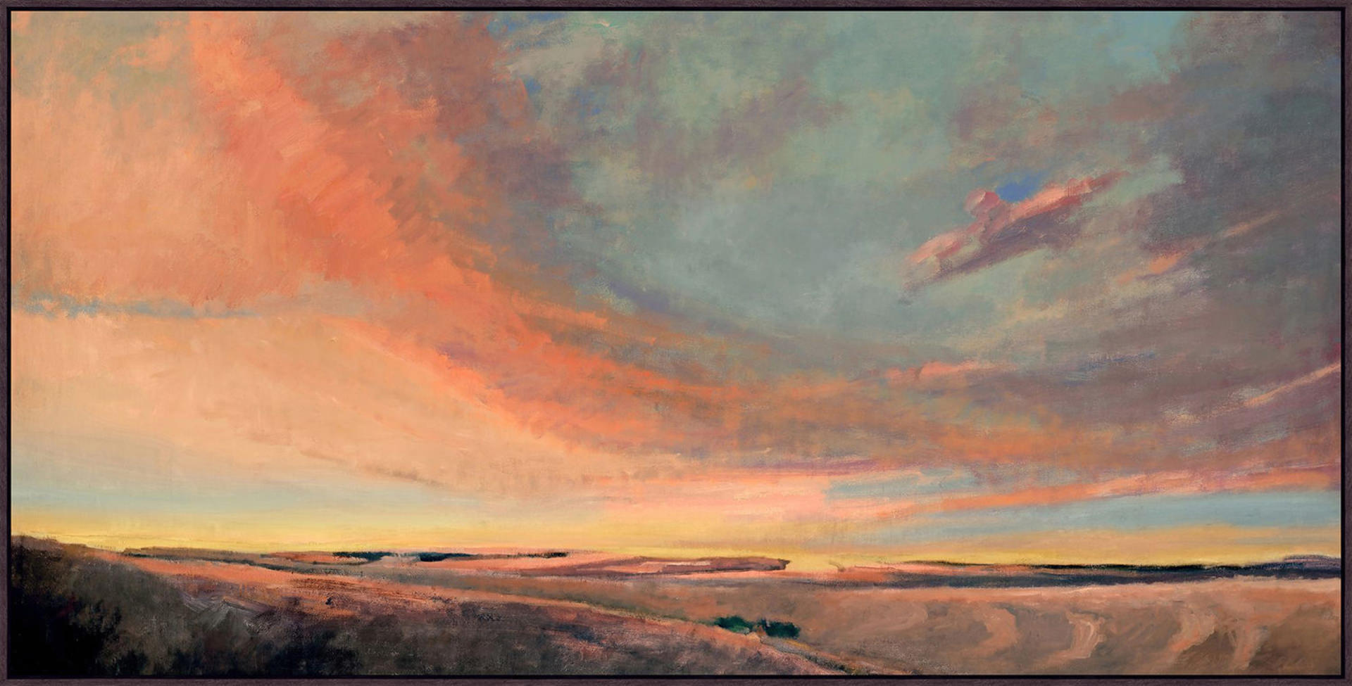 A bountiful pastel sky, over the landscape, Big Sky is an artist-enhanced, gallery-wrapped canvas. The depth of the espresso-toned narrow frame adds just enough emphasis to the overall appearance of this broadly beautiful art, in its complementary color scheme. This piece would look stunning in a living room with a cream or brown sofa, and accented with orange, yellow and blue accessories and home decor. You could also use it in a bedroom with a neutral upholstered headboard, and an area rug and bedding that matches the color palette.