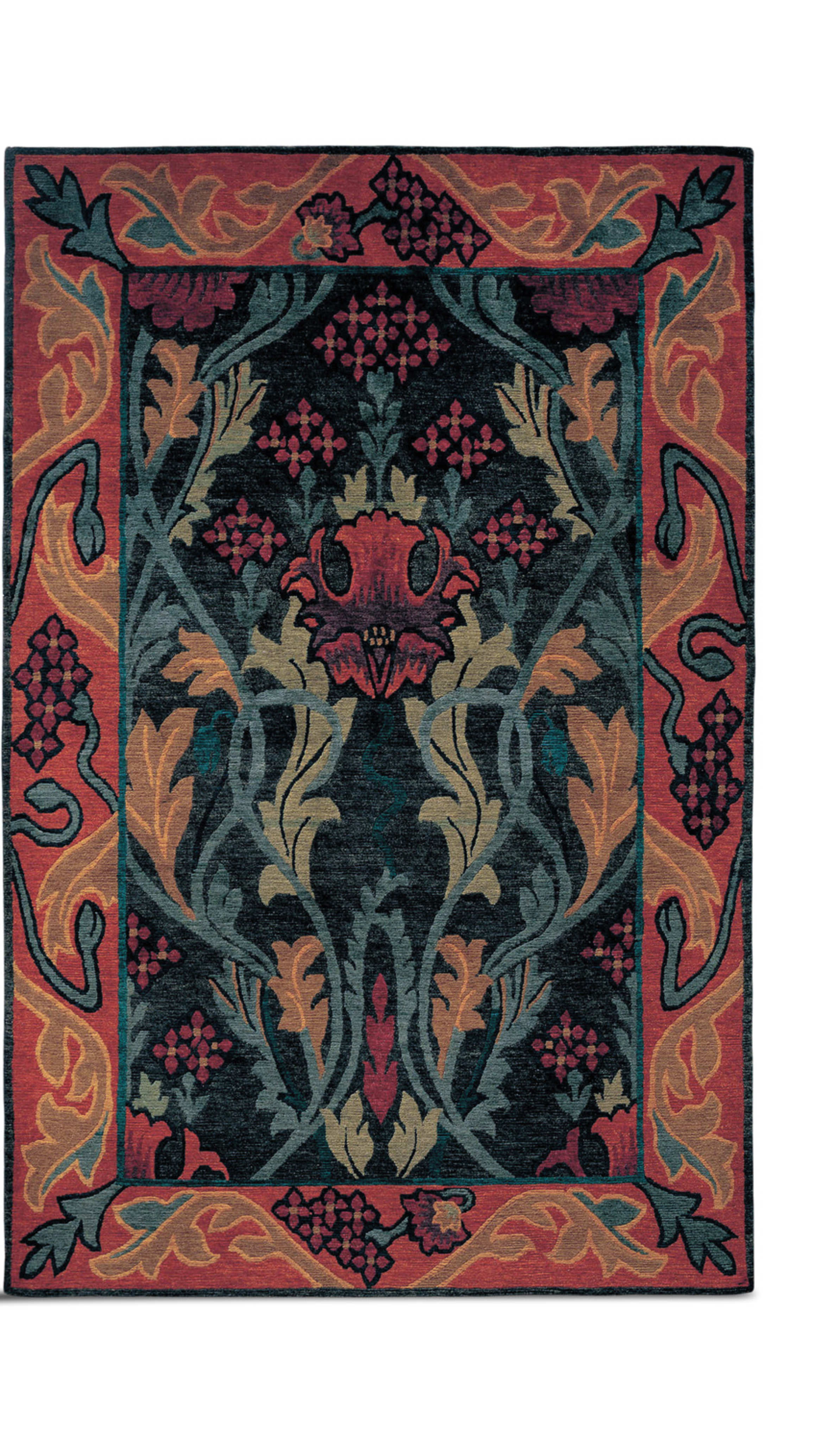 The striking color palette of red, blue and green is designed with flowing acanthus leaves and repeated floral motifs that make this rug a stunning design element for any room. While you could pair it with a neutral warm neutral sofa, it would also pair well with a light green or blue upholstery fabric. Throw pillows and wall art in the red colors will pull the whole look together.