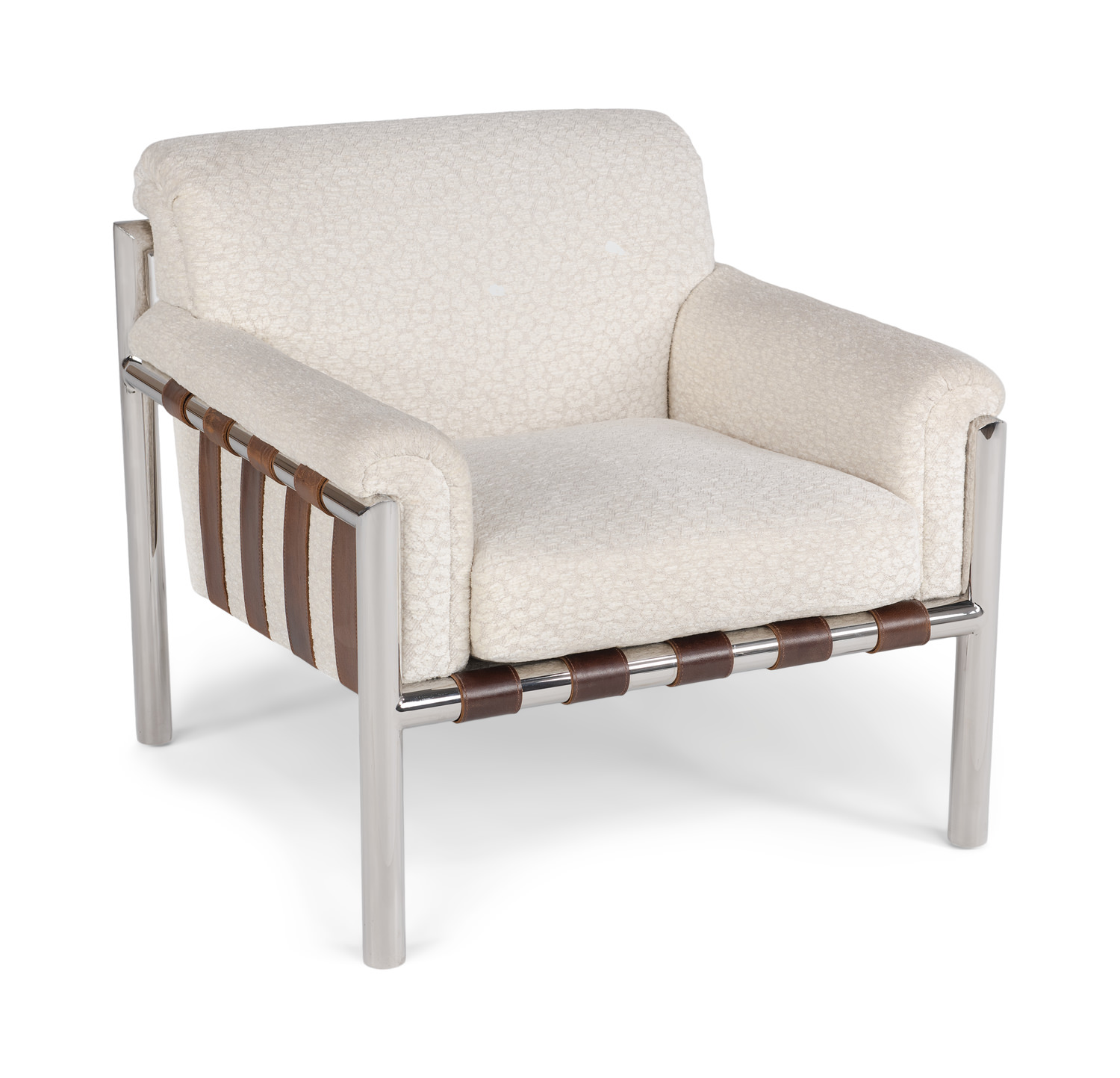 view storesThe Lian Chair is high style with a retro vibe. The tubular chrome frame is wrapped with leather straps on the front, sides and back. The upholstery fabric can be customized with hundreds of options to suite your taste. This chair is certain to be a conversation piece just as we show it or in any fabric you choose.