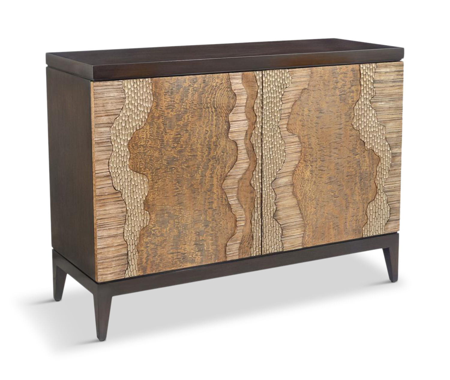 Introducing the exquisite River's Edge Chest from Gabberts, a true masterpiece in design and craftsmanship under the renowned John Richard Brand. The chest boasts a luxurious Rose Silver finish that exudes elegance and sophistication, setting it apart from the ordinary. With its espresso-finished wood material, this piece is not only visually stunning but also built to last. Featuring two doors with a single adjustable shelf, the River's Edge Chest offers ample storage space while maintaining a sleek and streamlined look. The door fronts showcase striking linear striations, adding a touch of modern flair to its classic design.