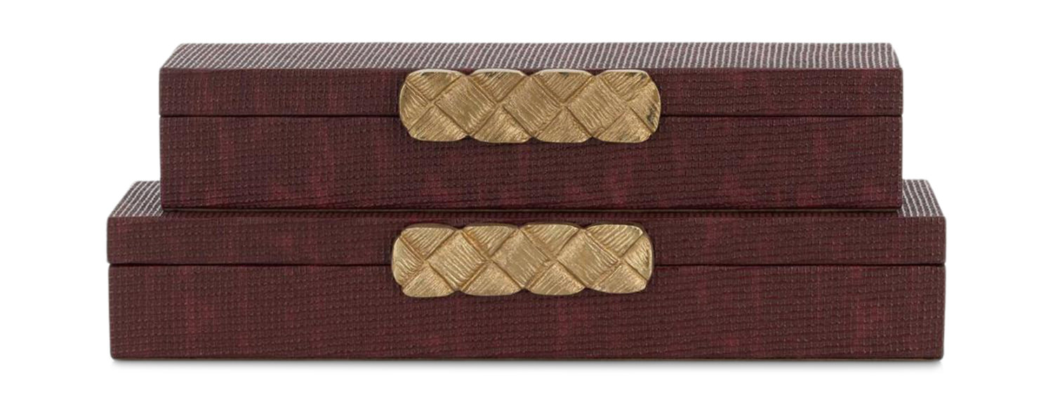 Introducing the exquisite Chateau Boxes Set of 2 from Gabberts, where luxury meets functionality. Embrace sophistication with these stunning burgundy-hued boxes that exude timeless elegance in any space. The dimensional surface adds depth and character, while the grey fabric inlay inside provides a plush resting place for your most treasured possessions. Adorned with ornate aluminum handles in a luxurious brass finish, these boxes are a true statement of opulence.