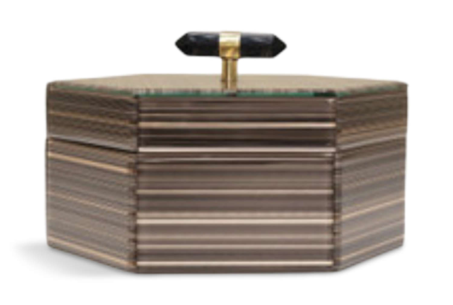 Introducing the Delena Box from Gabberts, where luxury meets functionality. This exquisitely crafted decorative box features a bold hexagon design that is sure to make a statement in any room. The rich brown tones and striped pattern add a touch of sophistication, while the black suede-lined interior provides a plush setting for your precious items. Versatile and perfectly proportioned for display, the Delena Box is a must-have for those who appreciate the finer things in life. Add a touch of elegance to your home décor with this stunning piece from Gabberts.