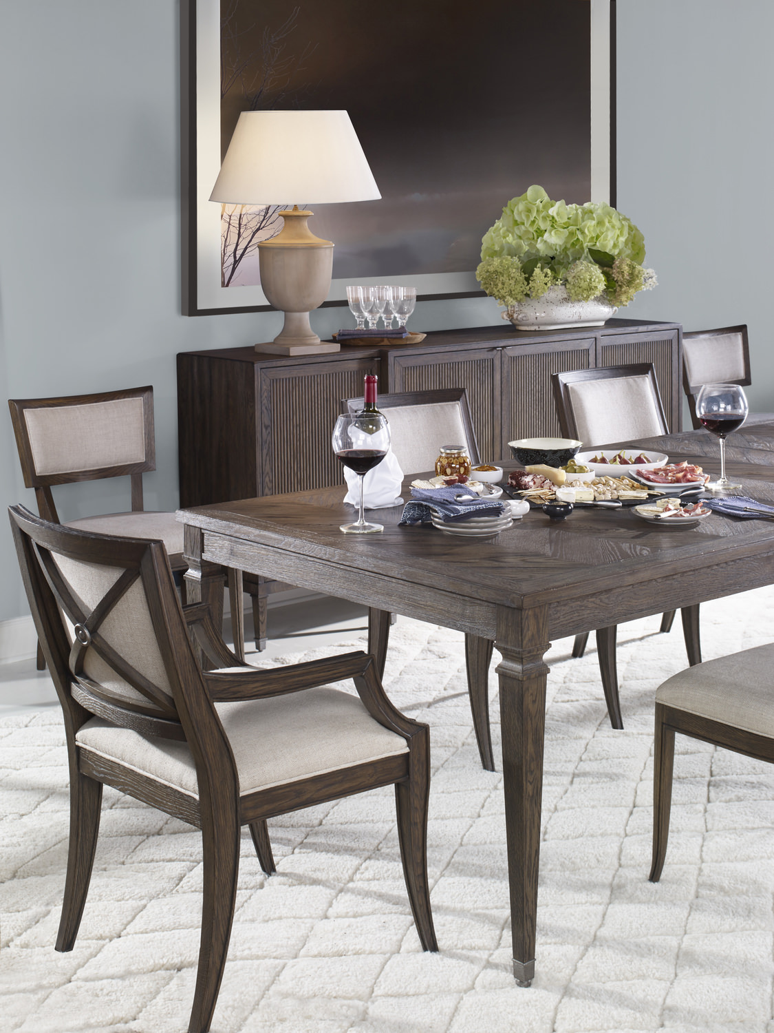 view storesEnhance your dining space with the timeless elegance of the Daniel 5 Piece Dining Set by Century. Crafted with a beautiful Rustic Brown finish and adorned with Pewter rosette details, this set exudes sophistication. The herringbone pattern on the veneer top adds a touch of intricate charm. Made from high-quality oak, this rectangular dining table can accommodate up to 6 people, making it ideal for gatherings.