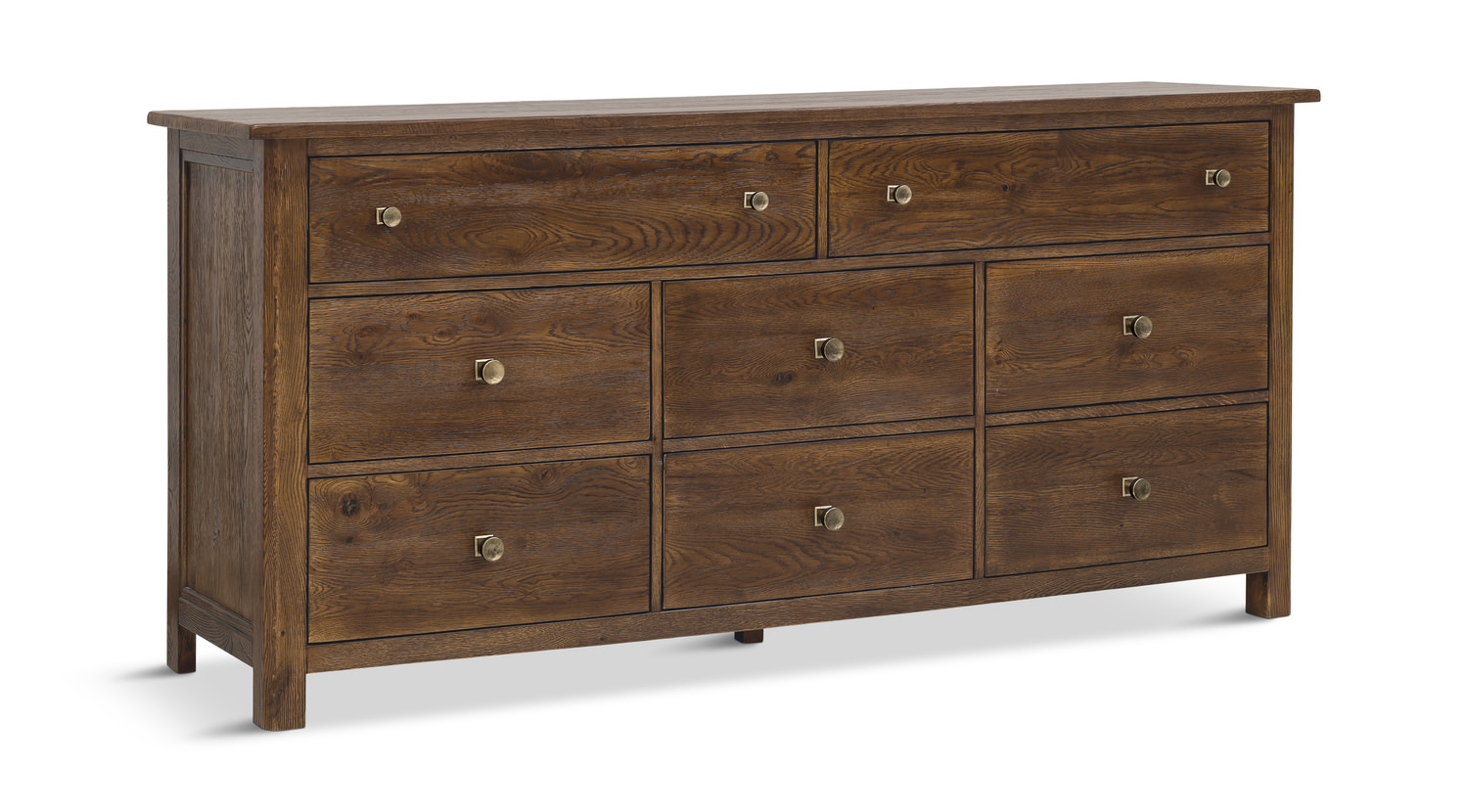 Enhance your bedroom with the timeless elegance of the Driftwood Eight Drawer Dresser from Hooker Furniture. Saddle finish Driftwood Crafted from oak solids and veneers, this dresser features a top drawer with a removable jewelry tray, ideal for keeping your accessories organized. The eight self-closing drawers provide ample storage space for your clothing and essentials. The three bottom drawers are cedar-lined to protect your belongings.