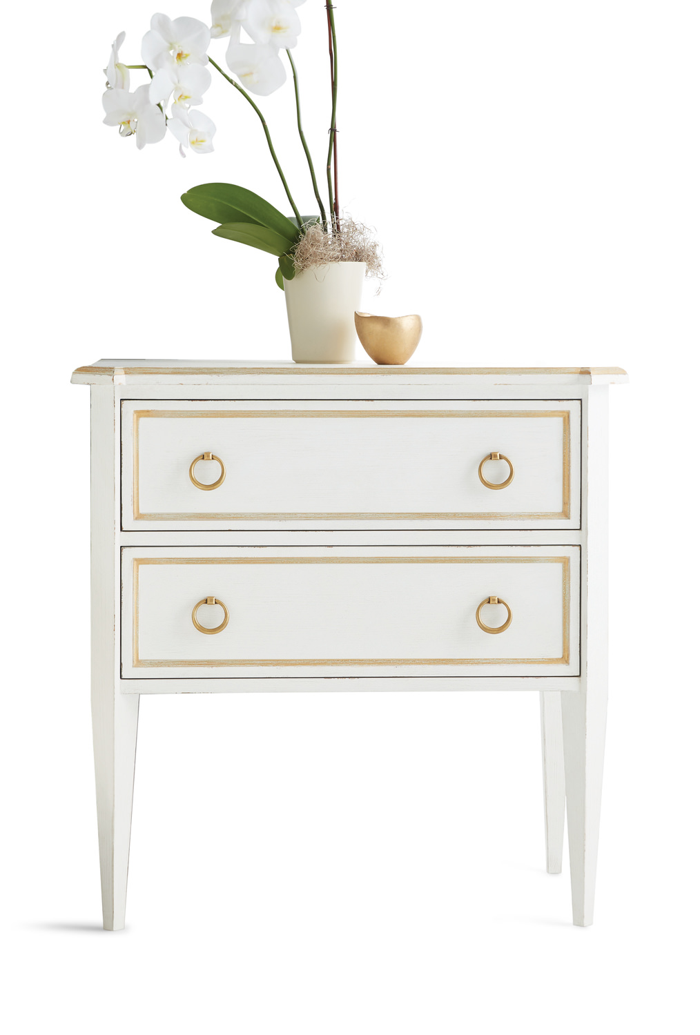 Discover the timeless elegance of the Covington Bedside Chest from Modern History. This exquisite piece features dimensions of 32"W X 20"D X 32"H, crafted from solid Okoume hardwood and finished in a luxurious white with delicate gold leaf accents. The solid brass hardware adds a touch of sophistication to this nightstand. With its light finish and impeccable construction, the Covington Bedside Chest is a must-have addition to any bedroom. Available only as shown,