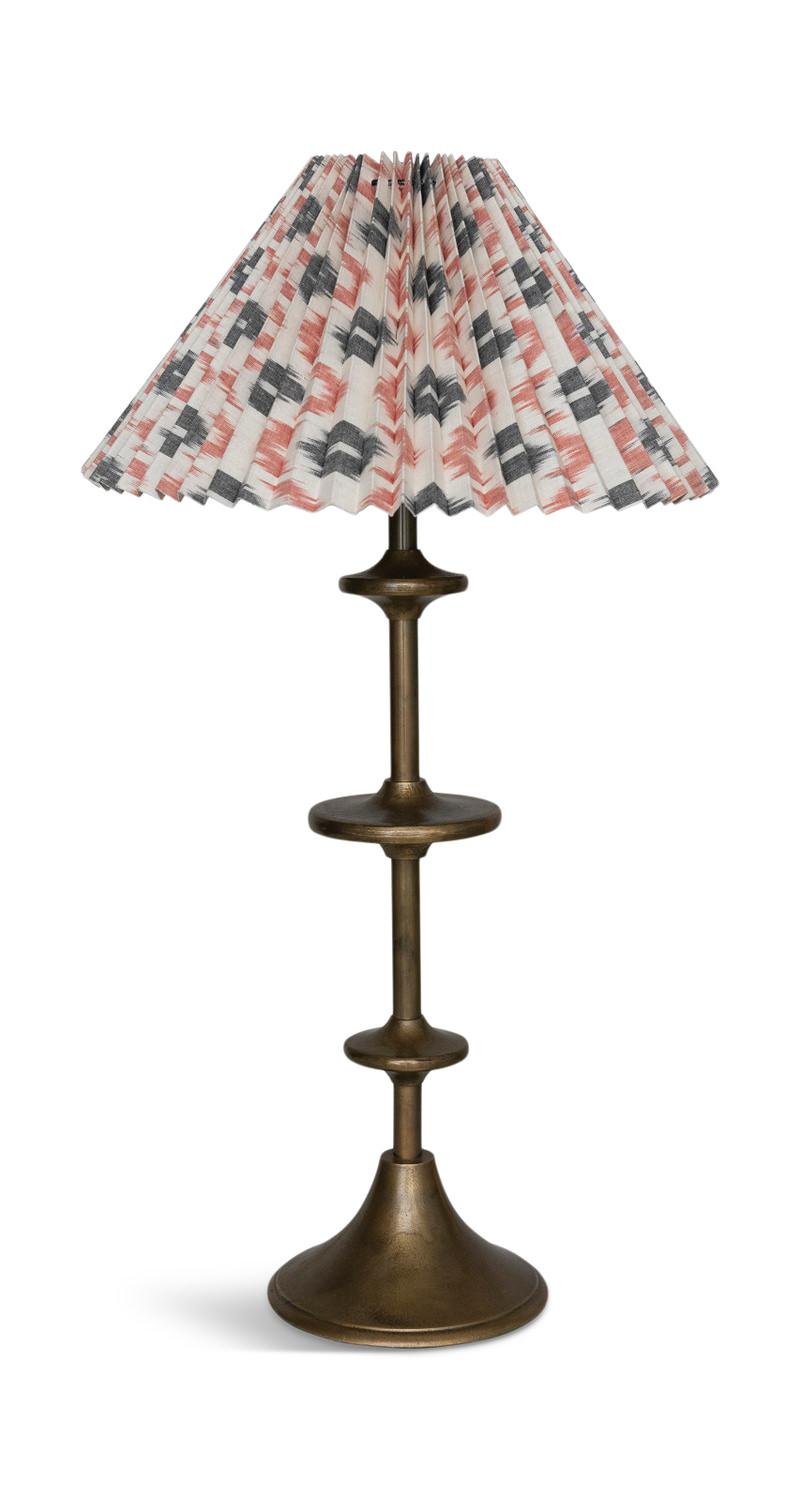 Introducing the exquisite Ikat Table Lamp from Gabberts, a stunning piece that brings a touch of elegance to any space. Crafted with a candlestick-inspired design and finished in antique brass, this lamp exudes timeless charm. The pleated cotton ikat shade in vibrant multi colors adds a pop of personality and style, making it perfect for homes with a classic vintage or eclectic décor. Illuminate your surroundings with sophistication and luxury with the Gabberts Ikat Table Lamp.